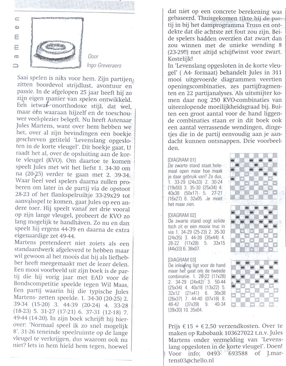 Binnenkort verschijnt een damboek van de Brabantse dammer Jules Martens. Het draagt de titel: 'Levenslang opgesloten in de korte vleugel'. Een soort levenswerk van de gedreven clubdammer, die daarmee zijn passie in beeld brengt van zo'n 25 jaar ervaring met een ingewikkeld spelsysteem in het dammen. Martens is geen topdammer, maar beschrijft het spel met een enorme gedrevenheid, waarbij geregeld een beroep wordt gedaan op het sterke damprogramma 'Truus' van Stef Keetman. Eerder kwam zijn provinciegenoot Adrie van Outheusden met een boek over de Partie Bonnard, waar een half jaar geleden melding van werd gemaakt in deze column. De intenties van Martens komen uit dezelfde liefde voor het spel voort. Dammen is een intensieve hobby en de Brabander groeide uit tot een speler met opvallende successen in dit lastige speltype. Hij liet zich graag opsluiten, omdat een gebonden spelsysteem tot boeiende confrontaties kan leiden. Het boek heeft een A4-formaat met een bindstrip en bestaat uit circa 85 pagina s, 311 duidelijke diagrammen, 14 openings-combinaties, 250 KVO combinaties, 22 partijanalyses en 6 partijfragmenten. Prijs 15 Euro + 2,50 Euro verzendkosten. Over te maken op Rabobank 103627022. t.n.v. Jules Martens, Mercuriusstraat 40, 5721 BG Asten. (tel: 0493-693588) Voor op en aanmerkingen: e-mailadres julestrudy40@gmail.com